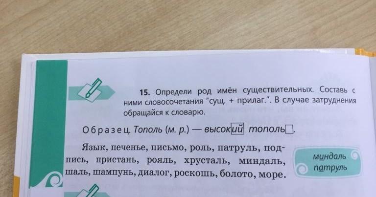 язык(мр.р) длинный язык ,печенье (ср.род или как оно называется) вкусное печенье, письмо (ср.род) странное письмо,роль(ж.род) главная роль ,патруль(мр.род) хз чо написать,подпись(ж.род) красивая подпись,пристань(ж.род) хз что написать,рояль(ж.род) хз что написать, хрусталь (ж.род либо м.род) хз что написать, миндаль (ж.род) ,шаль(ж.род),шампунь(мр.род) ,диалог(мр.род) большой диалог,роскошь(ср.род),болото(ср.род) противное болото,море(ср.род)