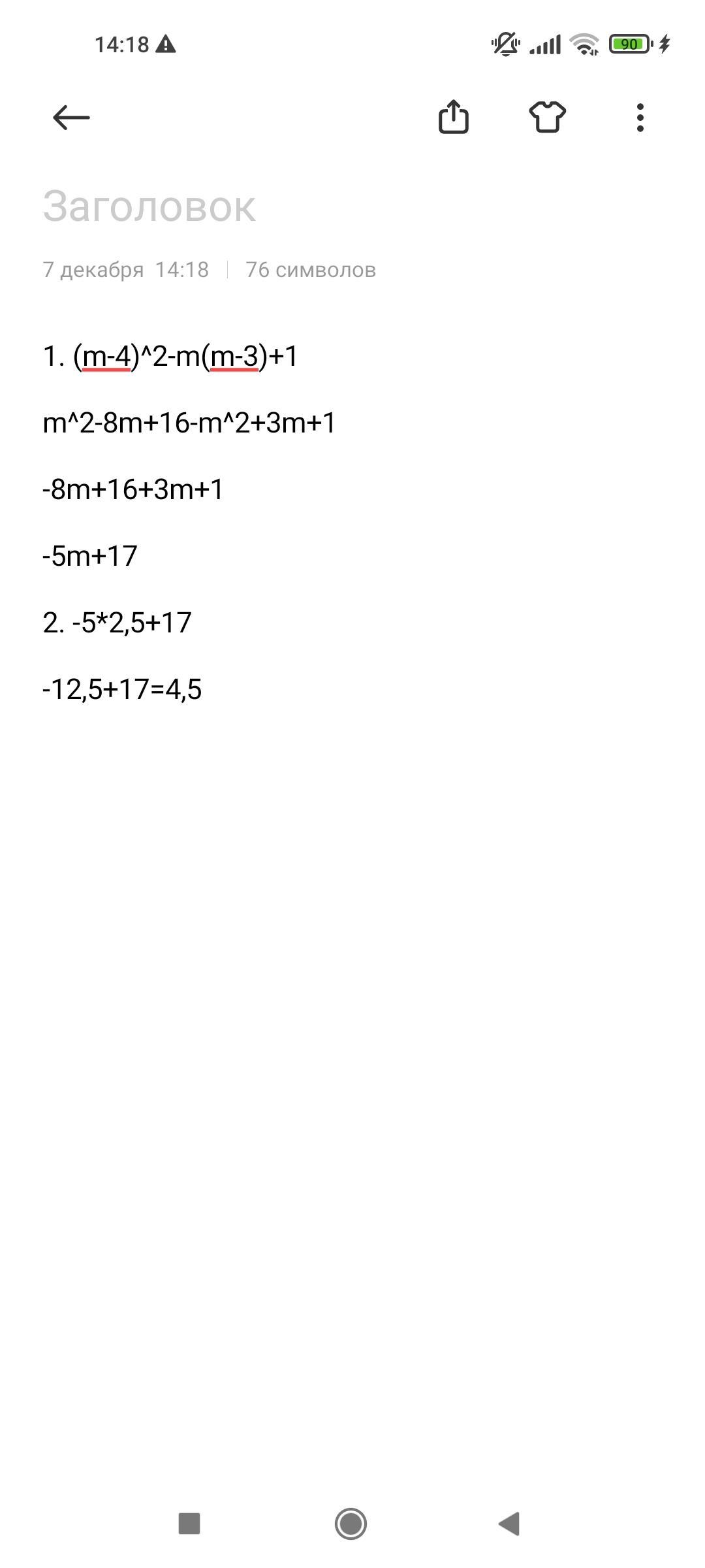 Спростіть вираз ( m-4)^ 2 - m(m - 3) + 1 i знайдіть його значення,якщо m=2,5 СРОЧНО!!!! даю 30 балов