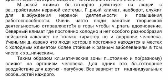 Морской клИмат благотворно действует на людей с растройствами нервной системы. Горный клИмат, наоборот, служит для возбуждения нервной деятельности и повышение работоспособности. Очень часто лЮди занятые творческой деятельностью отпровляются в горы что-бы черепать вдохновление. Севернный клИмат где постоянно холодно и нет особого разнобразия пейзажеи закаляет не только харАктер но и здоровье человека. Учеными доказано что лЮди котые постоянно находятся в местах с холодным климатом более стойкие к разным заболеваниям в том числе хроническим.