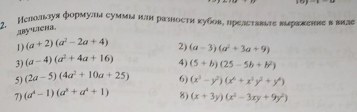 2. Используя формулы суммы или разности кубов, представите выражение в виде двучлена. 1) (a + 2) (a² - 2a + 4) 3) (a-4) (a² + 4a +16) 5) (2а - 5) (4a² 7) (a - 1) (a + a+1) + 10a +25) 2) (a-3) (d² +3a+9) 4) (5+ b) (25-5b+b) 6)(x-y) (+11+ 4 8) (x+3y) (² - 3xу +9) помогите пожалуйста срочно надо