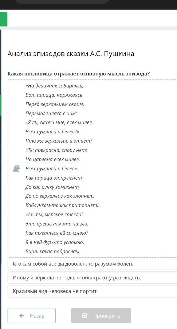 Какая пословица отражает основную мысль эпизода? «На девичник собираясь, Вот царица, наряжаясь Перед зеркальцем своим, Перемолвилася с ним: > Что же зеркальце в отвем? «Ты прекрасна, спору нем; Но царевна всех милее, Всех румяней и белее». Как царица отпрыгнем, Да как ручку замахнем, Да по зеркальцу как хлопнем, Каблучком-то как примопнем!.. > Кто сам собой всегда доволен, то разумом болен. Иному и зеркала не надо, чтобы красоту разглядеть. Красивый вид человека не портит.