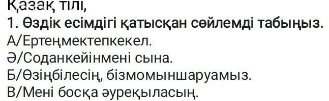 Қазақ тілі, 1. Өздік есімдігі қатысқан сөйлемді табыңыз. А/Ертеңмектепкекел. Ә/Соданкейінмені сына. Б/Өзіңбілесің, бізмомыншаруамыз. В/Мені босқа әуреқыласың.