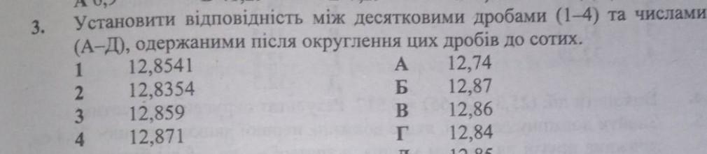 3. Установити відповідність між десятковими дробами (1-4) та числами (А-Д), одержаними після округлення цих дробів до сотих. 12,74 12,87 12,86 12,84 12 85 1 2 3 4 12,8541 12,8354 12,859 12,871 A Б B г T