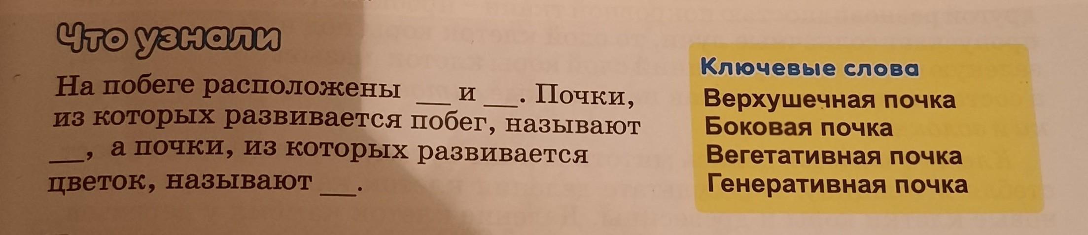 На побеге расположены Боковая почка и Верхушечная почка. Почки из которых развивается побег, называют Вегетативная почка, а почки, из которых развивается цветок, называют Генеративная почка.