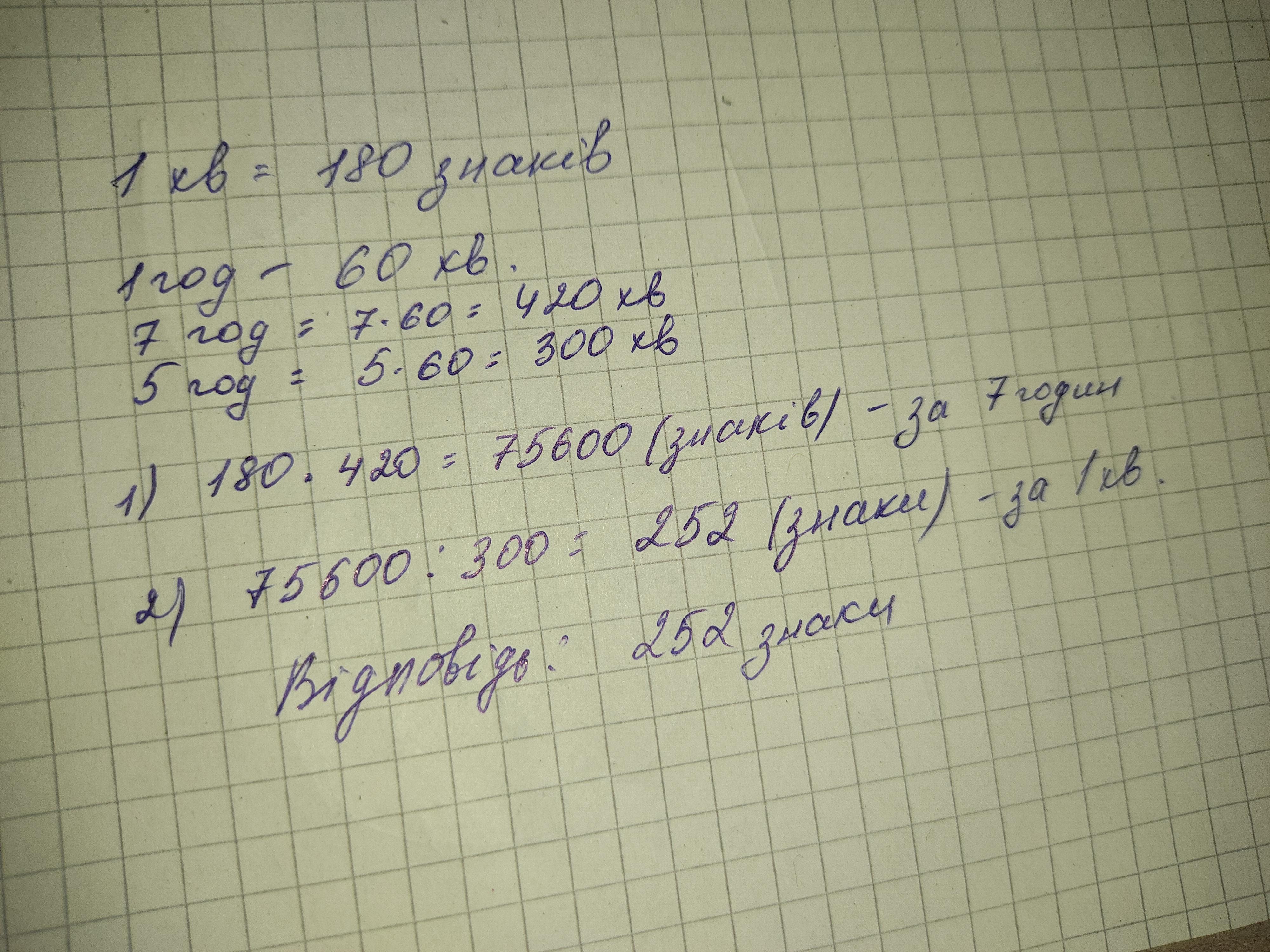 Друкуючи зi швидкiстю 180 знакiв за хвилину друкарка набирае рукопис за 7 годин, скiльки знакiв за хвилину мав друкувати друкарка щоб набрати цей рукопис за 5 годин?