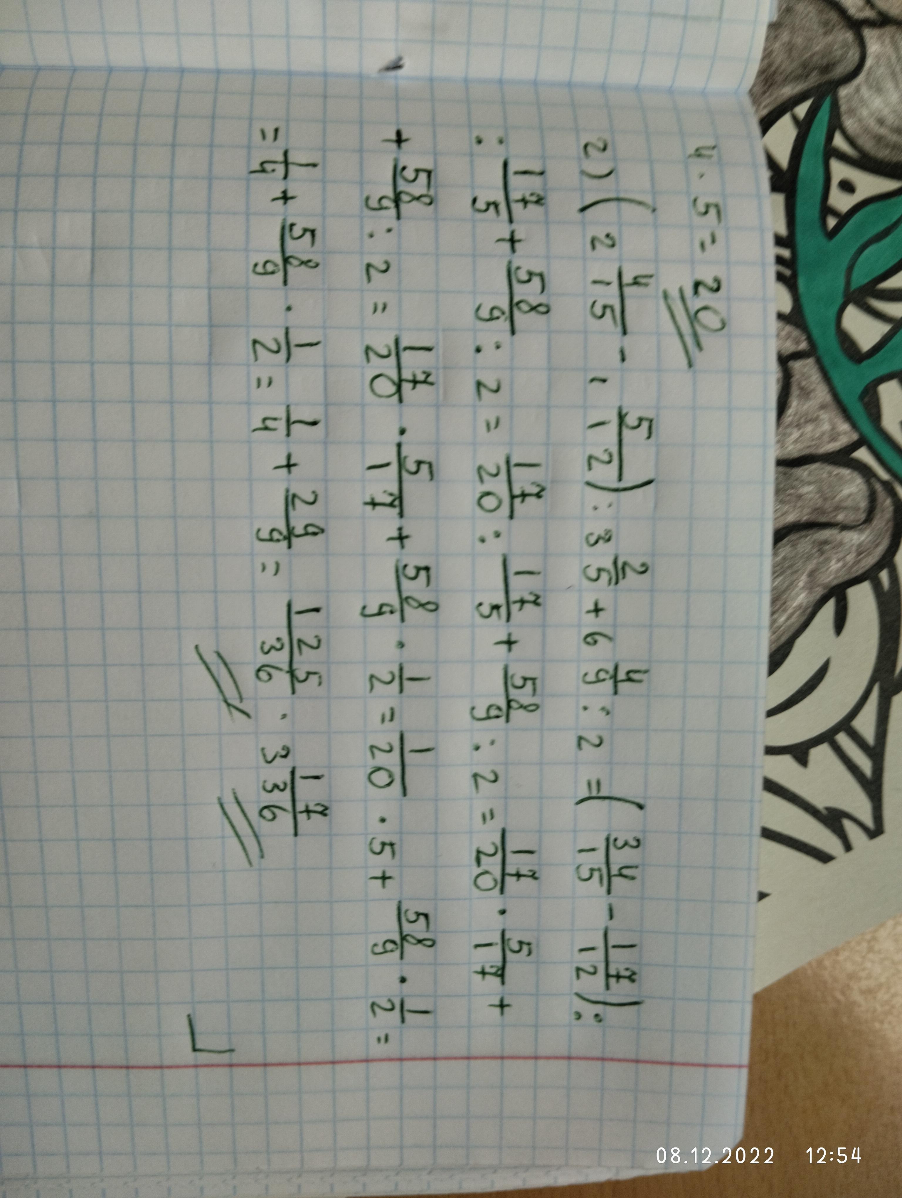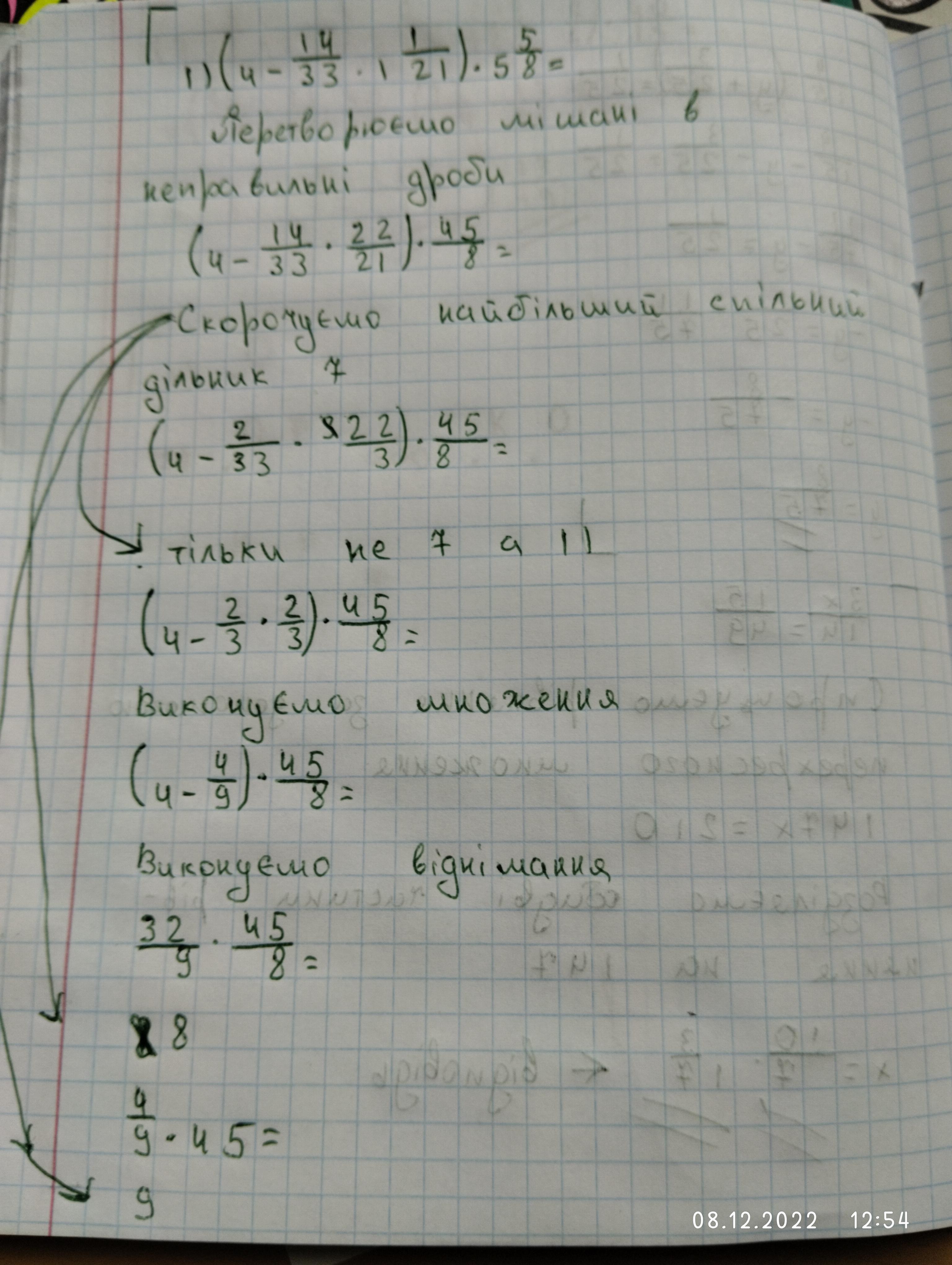 Виконайте дiї: 1) (4-14/33×1 1/21)×5 5/8; 2) (2 4/15-1 5/12):3 2/5+6 4/9:2
