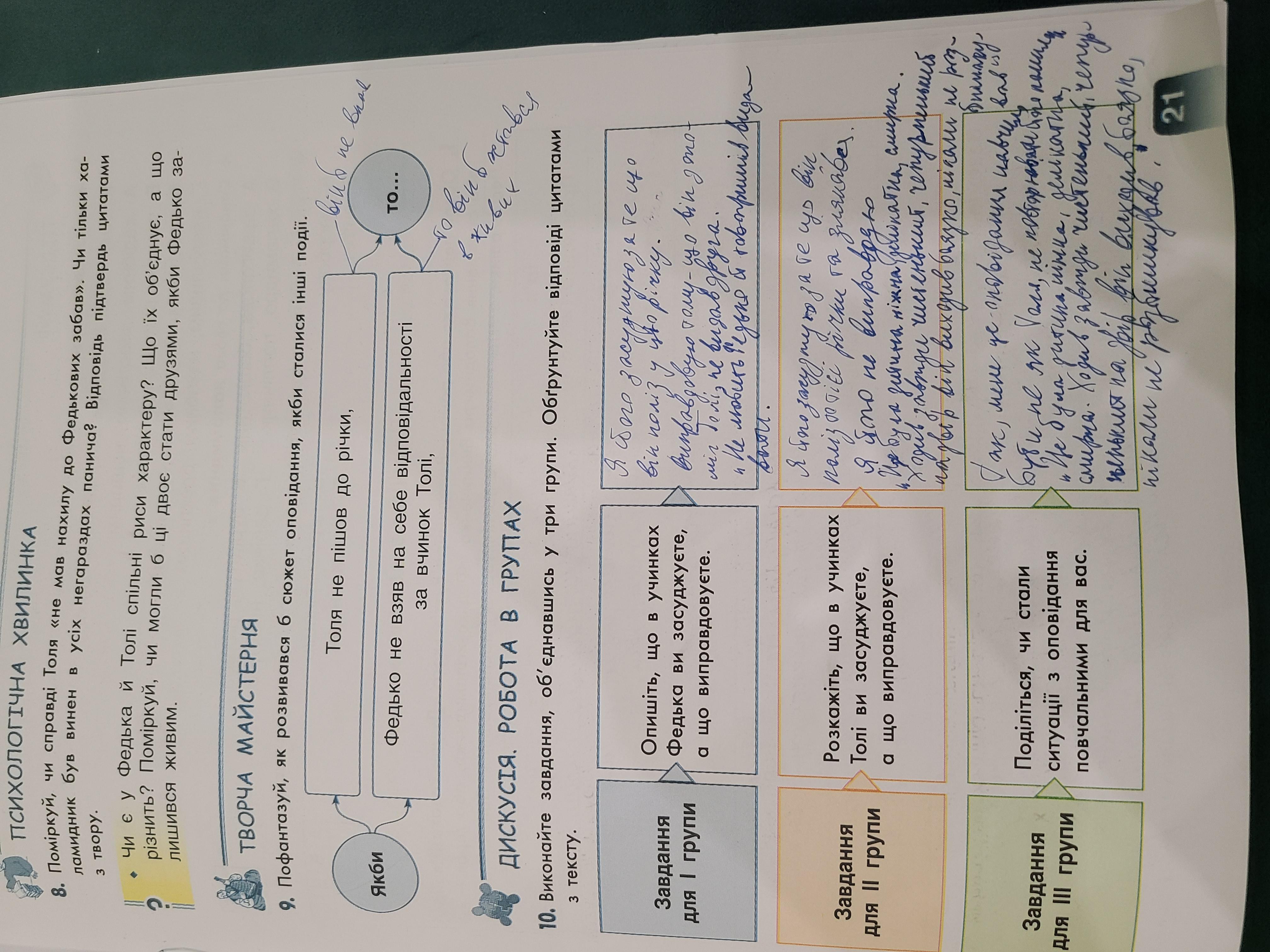10. Виконайте завдання, об'єднавшись у три групи. Обґрунтуйте відповіді цитатами 3 тексту. Завдання для 1 групи Завдання для II групи Завдання для III групи Опишіть, що в учинках Федька ви засуджуєте, а що виправдовуєте. Розкажіть, що в учинках Толi ви засуджуєте, а що виправдовуете. Поділіться, чи стали ситуації з оповідання повчальними для вас.