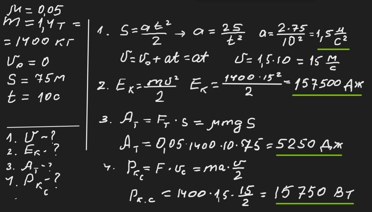 Автомобіль масою 1,4т рушає з місця, проходить шлях 75м за 10с.