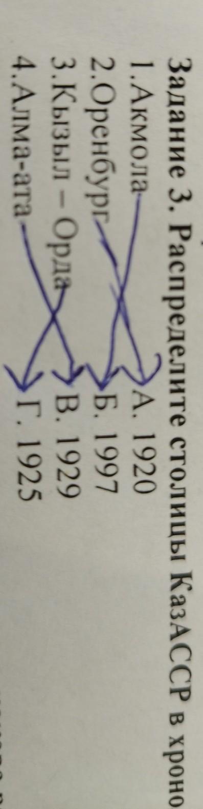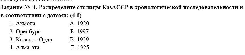 Задание № 4. Распределите столицы КазАССР в хронологической последовательности и в соответствии с датами: (4 б) 1. Акмола A. 1920 Б. 1997 B. 1929 Г. 1925 2. Оренбург 3. Кызыл-Орда 4. Алма-ата