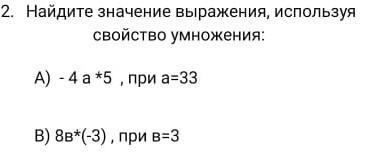 2. Найдите значение выражения, используя свойство умножения: A) - 4 а *5, при a=33 В) 8в*(-3), при в=3