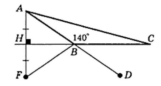 В треугольнике АВС угол АВС равен 140°. На продолжении высоты АН за точку Н отложен отрезок НF, равный АН, а на продолжении стороны АВ за точку В отмечена точка D. Найдите угол DВF.