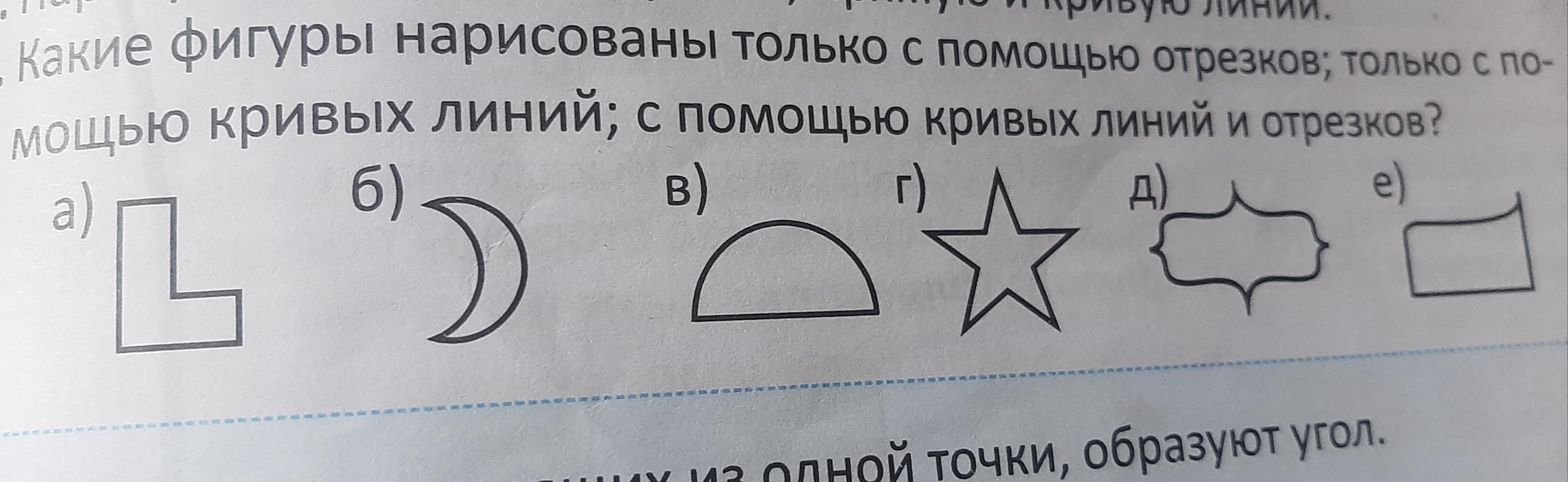 Какие фигуры нарисованы только с помощью отрезков;только с помощью кривых линий;с помощью кривых линий и отрезков?