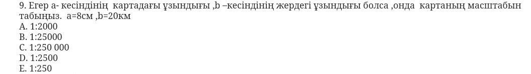 9. Егер а- кесіндінің картадағы ұзындығы ,b -кесіндінің жердегi ұзындығы болса, онда картаның масштабын табыныз. а=8см ,b=20км A. 1:2000 B. 1:25000 C. 1:250 000 D. 1:2500 E. 1:250