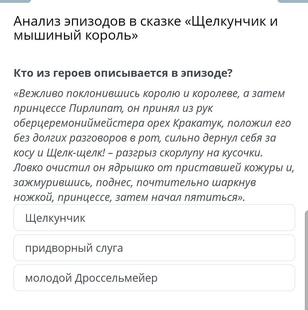 Анализ эпизодов в сказке «Щелкунчик и мышиный король» Кто из героев описывается в эпизоде? «Вежливо поклонившись королю и королеве, а затем принцессе Пирлипат, он принял из рук оберцеремониймейстера орех Кракамук, положил его без долгих разговоров в рот, сильно дернул себя за косу и Щелк-щелк! - разгрыз скорлупу на кусочки. Ловко очистил он ядрышко от приставшей кожуры и, зажмурившись, поднес, почтительно шаркнув ножкой, принцессе, затем начал пятиться». Щелкунчик придворный слуга молодой Дроссельмейер Проверить
