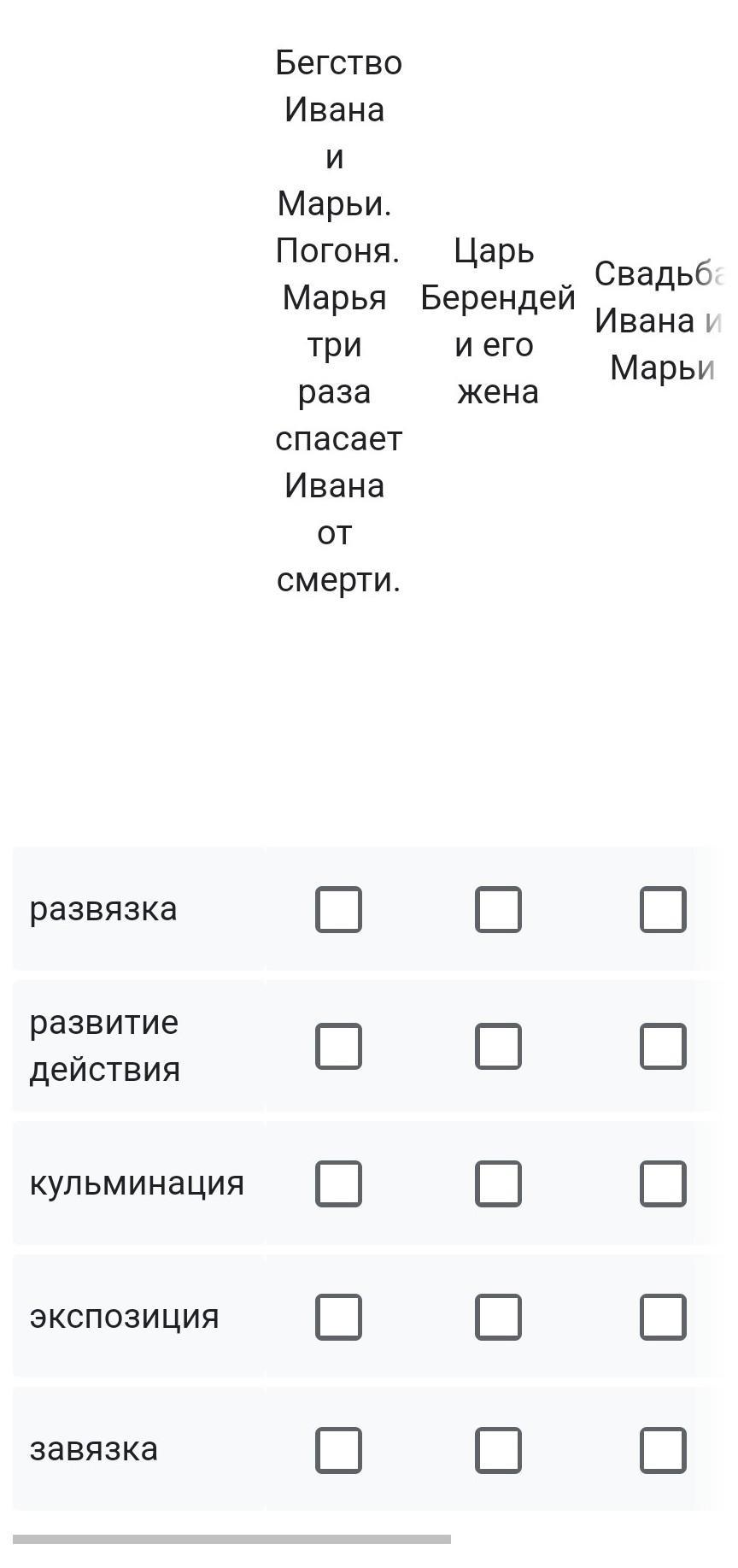 Найди соответствие Бегство Ивана и Марьи. Погоня. Марья три раза спасает Ивана от смерти. Царь Берендей и его жена Свадьба Ивана и Марьи Встреча с