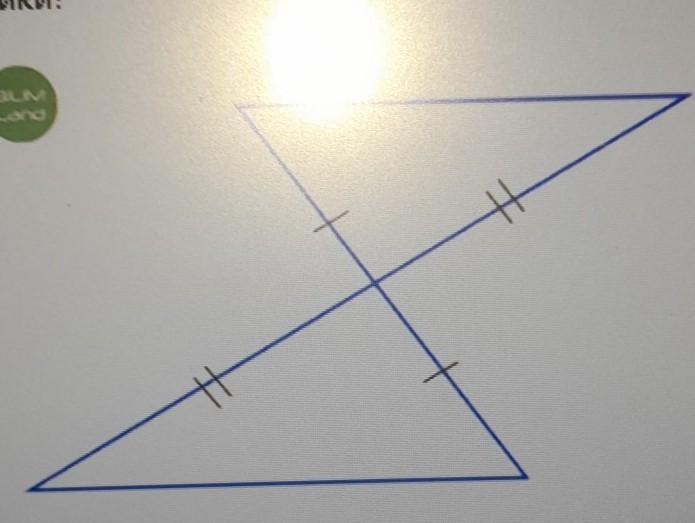 треугольники равны по первому признаку равенства. по двум сторонам и углом между ними. (там вертикальные углы а они равны)