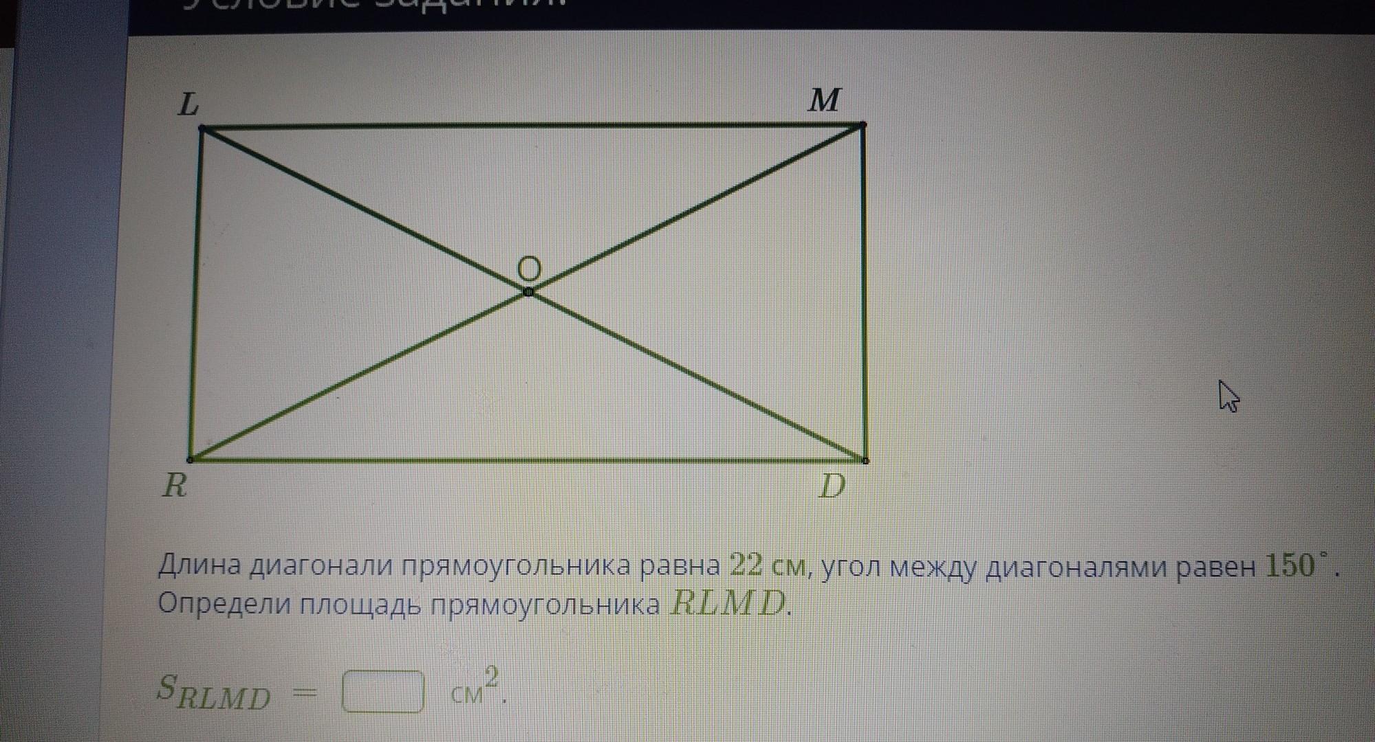 Длина диагонали прямоугольника равна 22 см, угол между диагоналями равен 150°. Определи площадь прямоугольника RLMD. пожалуйста помогите