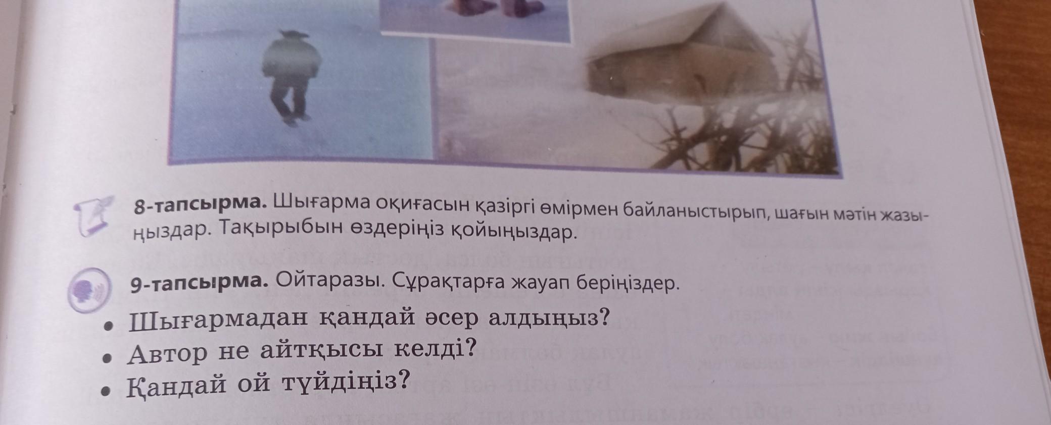 9-тапсырма. Ойтаразы. Сұрақтарға жауап беріңіздер. • Шығармадан қандай әсер алдыңыз? • Автор не айтқысы келді? • Кандай ой түйдіңіз? 8-9 тапсырма