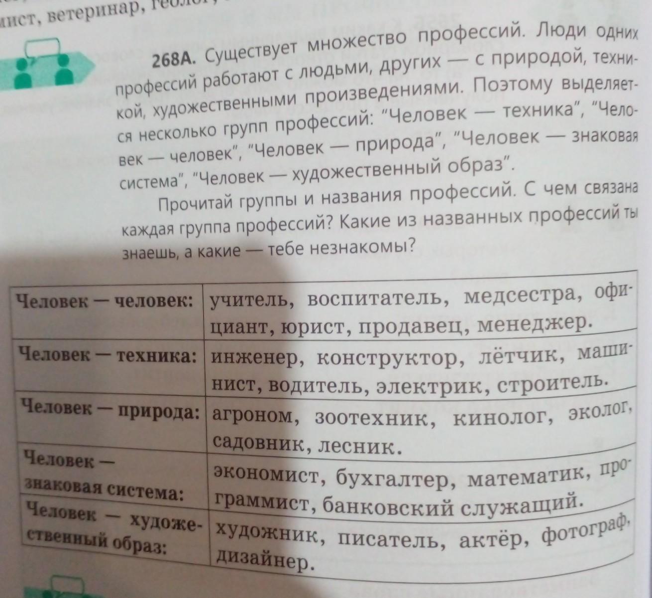 268А. Существует множество профессий. Люди одних профессий работают с людьми, других — с природой, техни- кой, художественными произведениями. Поэтому выделяет- ся несколько групп профессий: "Человек — техника", "Чело- век - человек", "Человек природа", "Человек система", "Человек - художественный образ". знаковая - Прочитай группы и названия профессий. С чем связана каждая группа профессий? Какие из названных профессий ты знаешь, а какие-тебе незнакомы? Человек - человек: учитель, воспитатель, медсестра, офи- циант, юрист, продавец, менеджер. Человек - техника: инженер, конструктор, лётчик, маши- нист, водитель, электрик, строитель. Человек - природа: агроном, зоотехник, кинолог, эколог, садовник, лесник. экономист, бухгалтер, математик, про- граммист, банковский служащий. художе- художник, писатель, актёр, фотограф, дизайнер. Человек - знаковая система: Человек ственный образ: