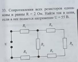 2) Е) Уменьшится в 2 раза. И 3 33. Сопротивления всех резисторов одина- ковы и равны R = 2 Ом. Найти ток в цепи, если в нее подается напряжение U = 55 в.