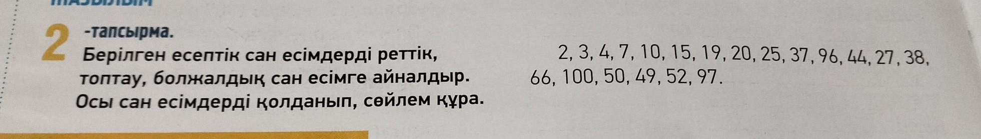 -тапсырма. Берілген есептік сан есімдерді реттік, топтау, болжалдық сан есімге айналдыр. Осы сан есімдерді қолданып, сөйлем құра. 2, 3, 4, 7, 10, 15, 19, 20, 25, 37, 96, 44, 27, 38, 66, 100, 50, 49, 52, 97.