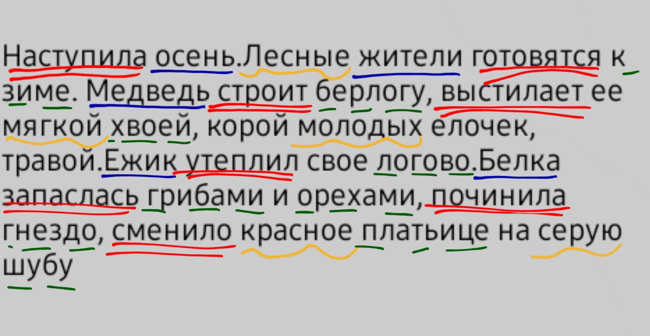 Синее это подлежащее, красное это сказуемое,желтое это определение а зеленое это дополнение