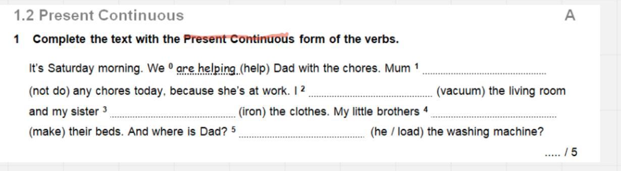 Mum isn't (is not) doing any chores today, because she's at work. l am vacuuming the living room and my sister is ironing the clothes. My little brothers are making their beds. And where is Dad? He is loading the washing machine?