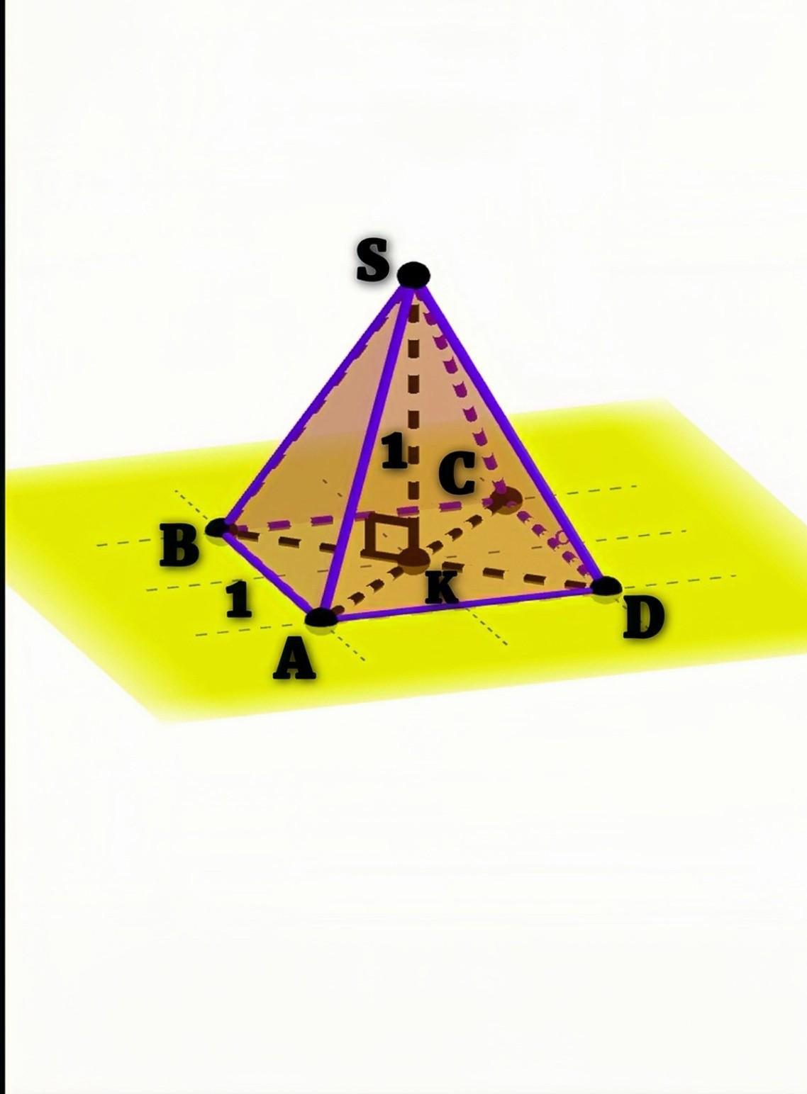 Дано: SABCD - правильная четырехугольная пирамида, АВ = 1см, SK = 1см, ВК ⟂ (АВС)