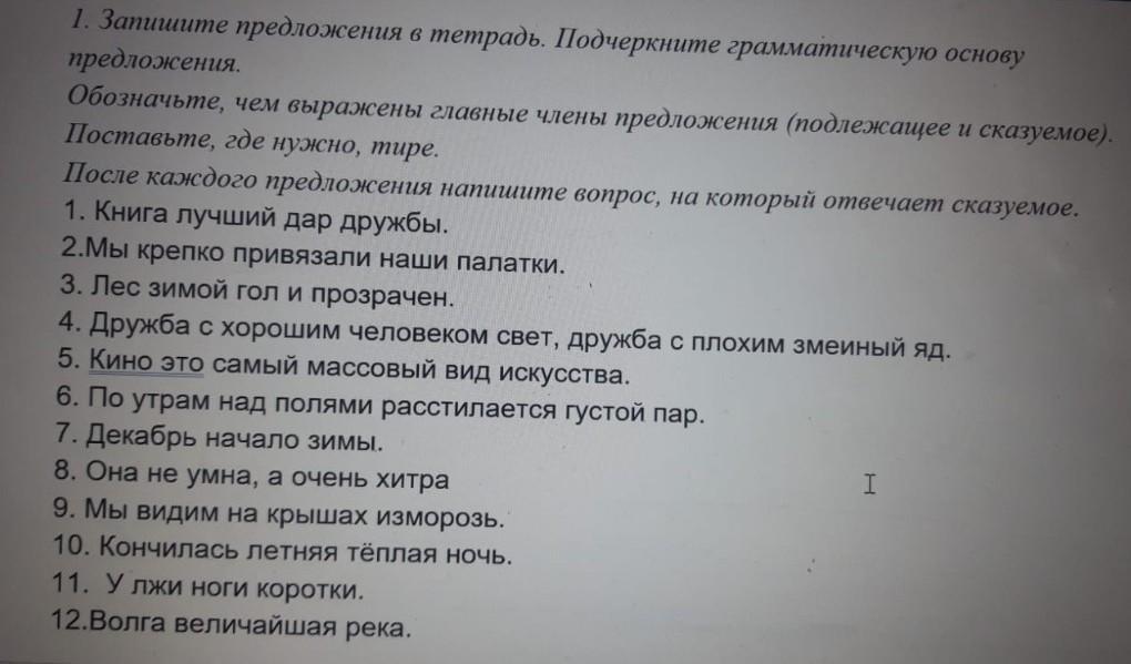 гол и прозрачен. 4. Дружба с хорошим человеком свет, дружба с плохим змеиный яд. 5. Кино это самый массовый вид искусства. 6. По утрам над полями расстилается густой пар. 7. Декабрь начало зимы. 8. Она не умна, а очень хитра 9. Мы видим на крышах изморозь. 10. Кончилась летняя тёплая ночь. 11. У лжи ноги коротки. 12.Волга величайшая река. СРОЧНО ДАМ 30 БАЛОВ