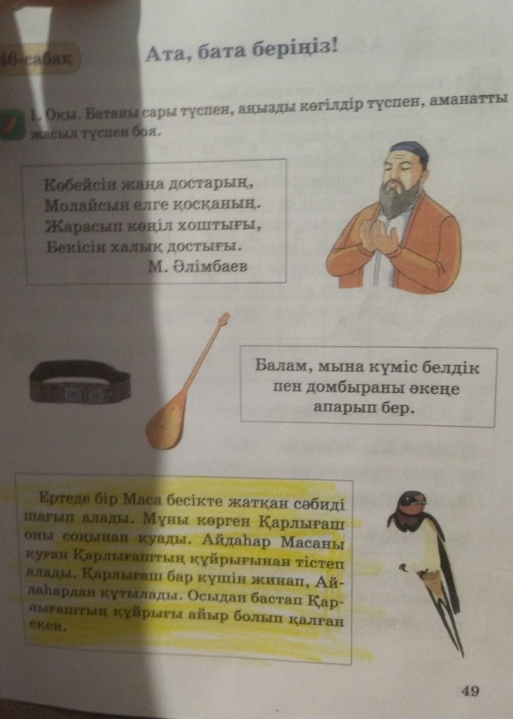 Ата, бата берініз! 1. Окы. Батаны сары түспен, анызды когiлдiр туспен, аманатты жасыл түспен боя. Кобейсiн жана достарын, Молайсын елге косканын. Жарасып көніл хоштыры, Бекісін халык достығы. М. Әлімбаев Балам, мына куміс белдік пен домбыраны әкене апарып бер. Ертеде бір Маса бесікте жаткан сәбидi шагып алады. Мұны көрген Карлыгаш оны сонынан куады. Айдаһар Масаны куган Карлыгаштын куйрыгынан тістеп алады. Карлыгаш бар кушiн жинап, Ай- даһардан кутылады. Осыдан бастап Қар лыгаштык куйрыгы айыр болып калга 49