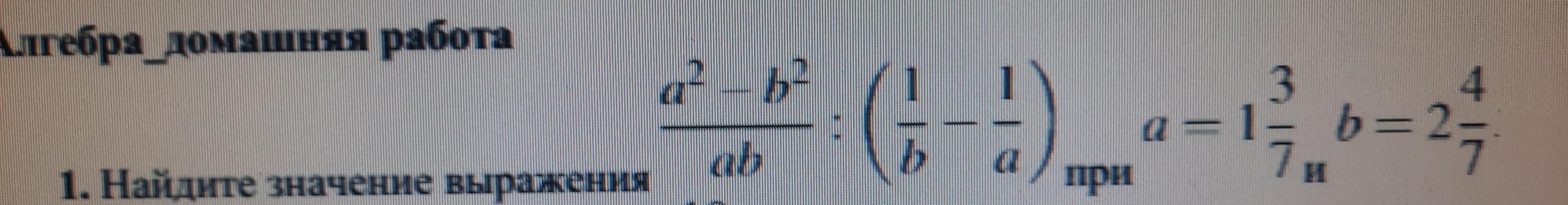 ДАЮ 100 БАЛЛОВ РЕШИТЕ УРАВНЕНИЕ НА КАРТИНКЕ УМОЛЯЮ a²-b²/ab:(1/b - 1/a) при a = 1 3/7, b = 2 4/7
