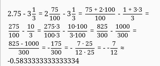 2,75-3 1/3=(3 1/3-2,75)=-(3 1/3-2 75/100)=-(3 1/3-2 3/4)=-(1 4/12-9/12)=-(12/12-9/12)=-3/12=-1/4