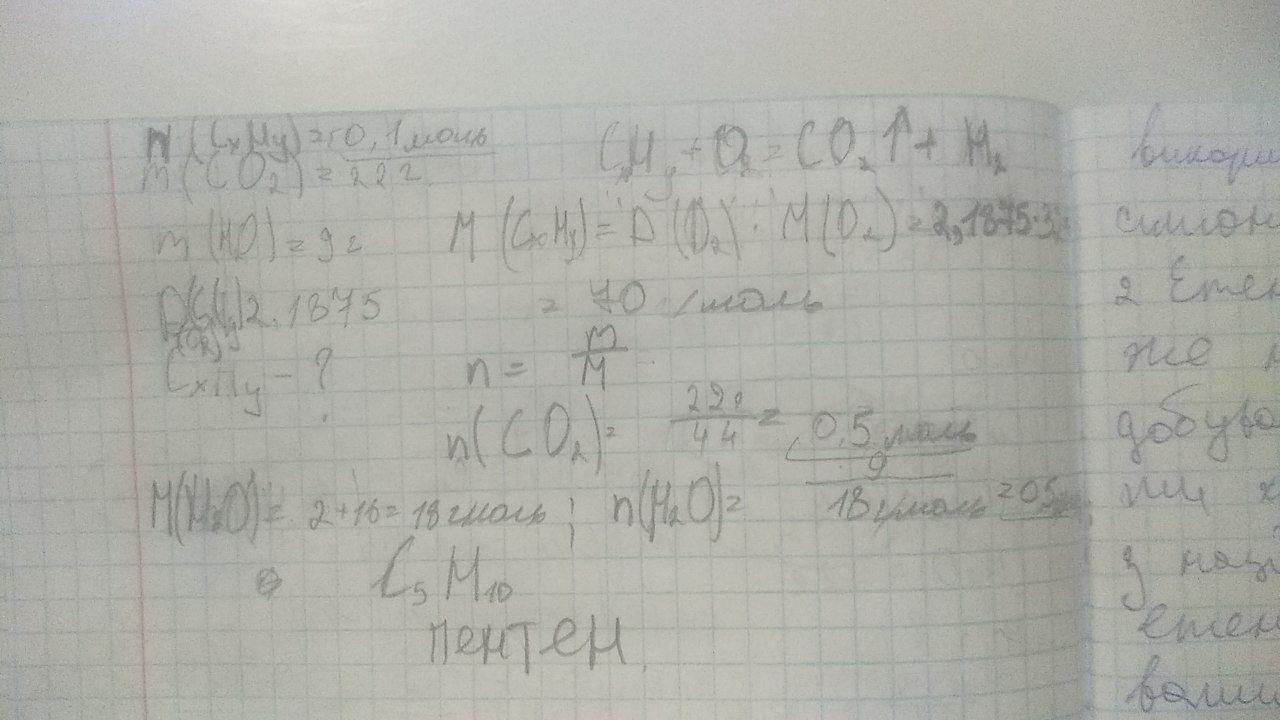 Знайдіть формулу вуглеводню, якщо відомо, що при спалюванню вуглеводню кількістю 0,1 моль, утворився вуглекислий газ масою 22 г та вода масою 9 г .Відносна густина пару вуглеводню за киснем становить 2,1875.