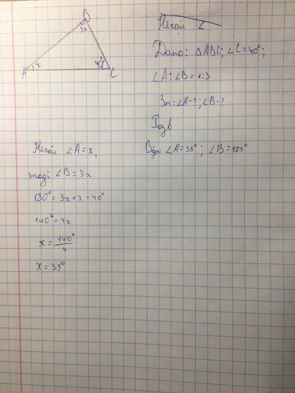 один із кутів трикутника дорівнює 40°, а другий кут утричі менший від третього. Знайдіть другий і третій кути трикутника.