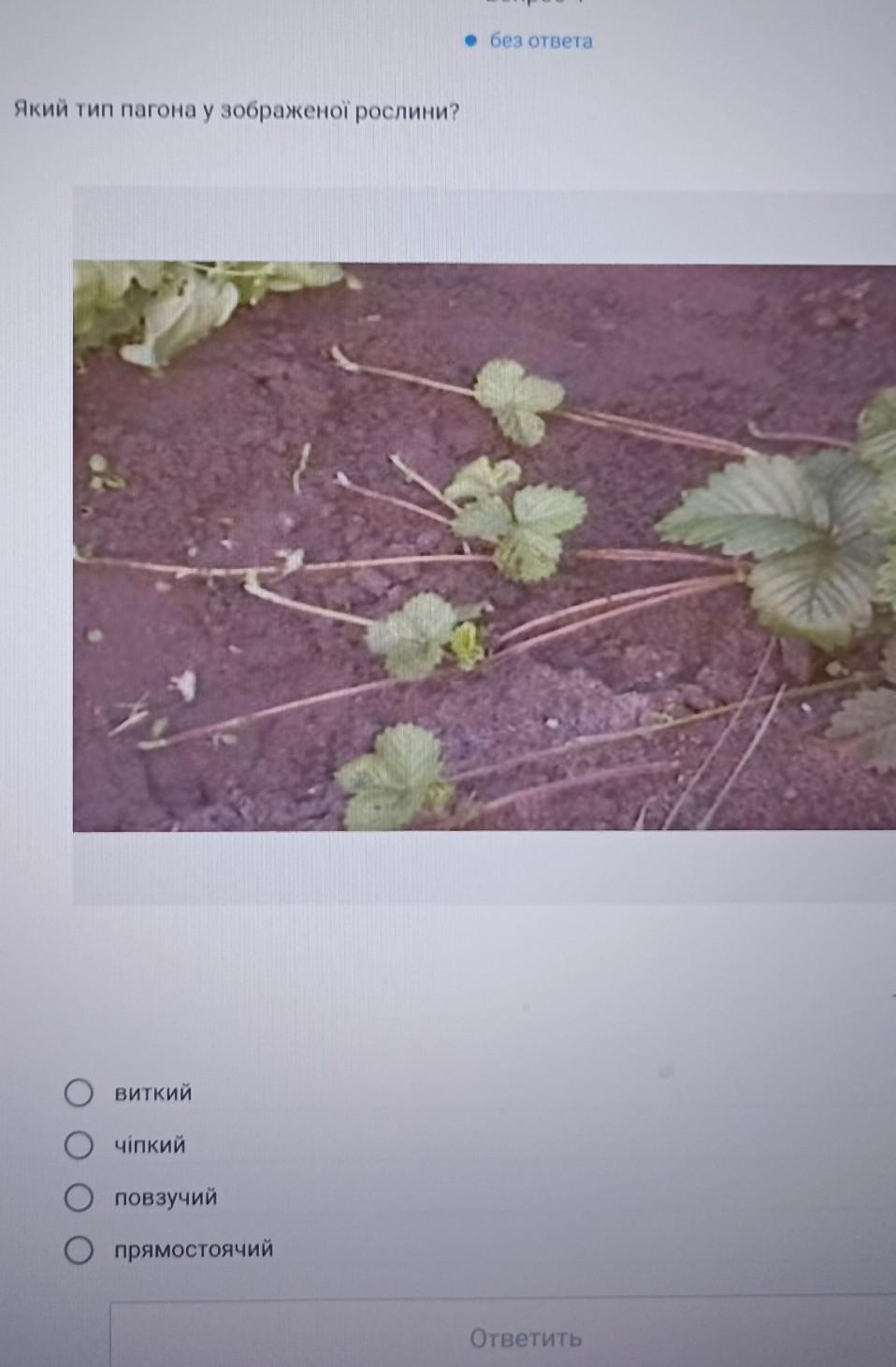 Який тип пагона у зображеної рослини? виткий О чiпкий О ПОВЗУЧий прямостоячий Ответить - / 1 бал
