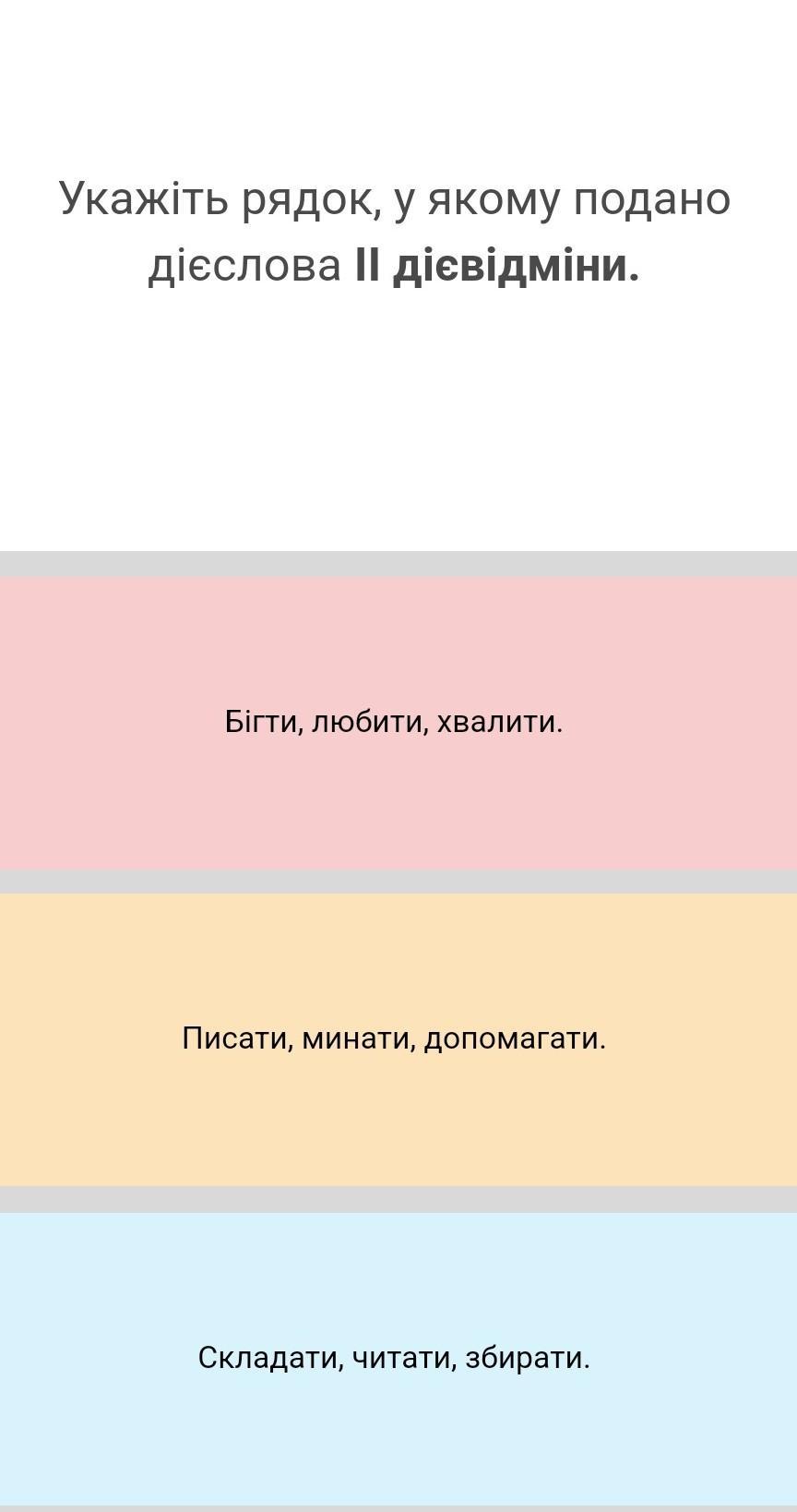 Укажіть рядок, у якому подано дієслова II дієвідміни. Бігти, любити, хвалити. Писати, минати, допомагати. Складати, читати, збирати.