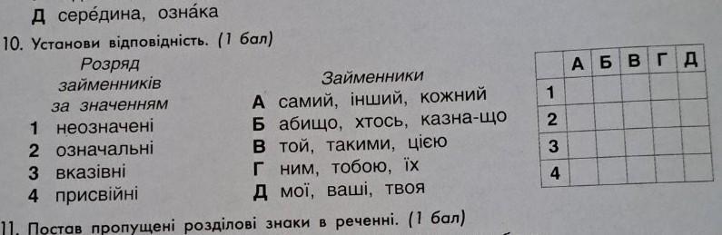 10. Установи вiдповiднiсть. (1 бал) Розряд займенникiв 1 за значенням неозначені 2 означальнi 3 вказівні 4 присвійні Займенники А самий, інший, кожний Б абищо, хтось, казна-що В той, такими, цією Г ним, тобою, їх Д мої, Ваші, твоя