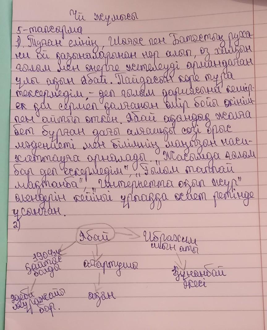 1) Абай туралы пікірлерді. Абайдың даналык сөздерін негізге алып, екі тапсырманын бiрiн орындар 1. .Men таныган Абай такырыбында хабарламалык се (а са ны - 70) жазындар. Эссе жазу барысында көнерген сөздердін колданылуына мән берiндер