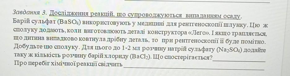 Завдання 3. Дослідження реакцій, що супроводжуються випаданням осаду. Барій сульфат (ВаSО4) використовують у медицинi для рентгеноскопії шлунку. Цю ж сполуку додають, коли виготовлюють деталі конструктора «Лего». І якщо трапляється, що дитина випадково ковтнула дрібну деталь, то при рентгеноскопії її буде помітно. Добудьте цю сполуку. Для цього до 1-2 мл розчину натрій сульфату (Na2SO4) додайте таку ж кiлькiсть розчину барiй хлориду (Вас). Що спостерігається? Про перебіг хімічної реакції свідчить