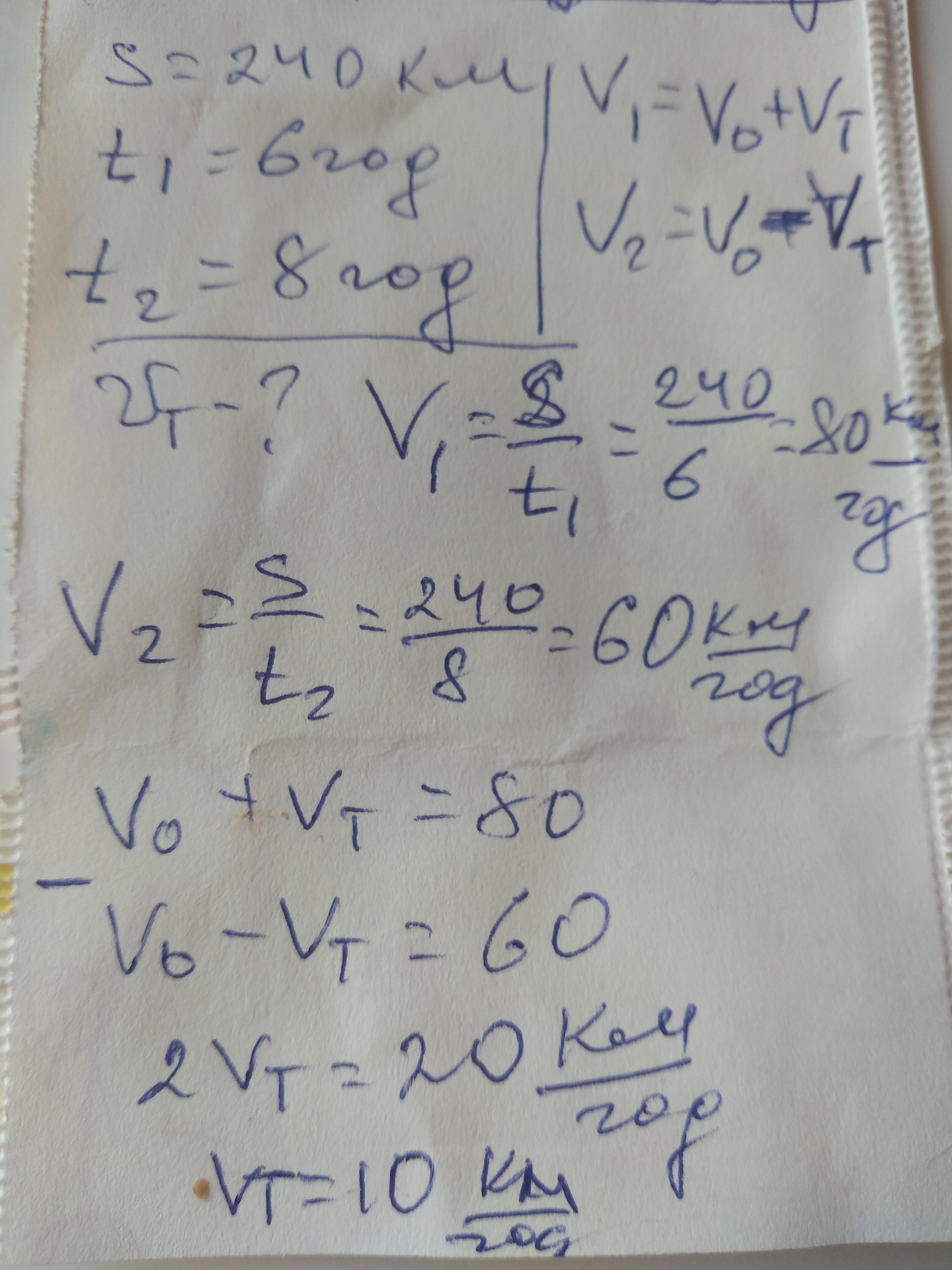 Відстань між двома пристаннями на річці становить 240км. Катер проходить цю відстань за течією річки за 6 год, а проти течії - за 8 год. Чому дорівнює швидкість течії?