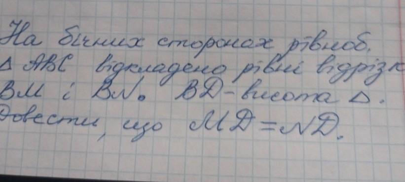 Трикутник ABC,AB-BC кутА-КутС-BM-BH,Значить,AM=CH,ВД медіана, АД=СД,Трикутник АМД=трикутник ДНС по обидва боки АМ=СН АД=СД і кут між ними кутА=кутС, ИД = НД