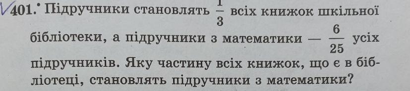 1/3 * 6/25 = 1/1 * 3/25 = 1 * 3 / 1 * 25 = 3/25 ( част ) - становлять підручники з математики