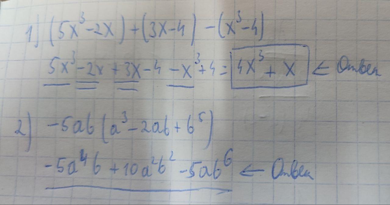 1) (5x^3 –2x) + (3x – 4) – (x^3 – 4) ; 2) –5ab(a^3 – 2ab + b^5 ).