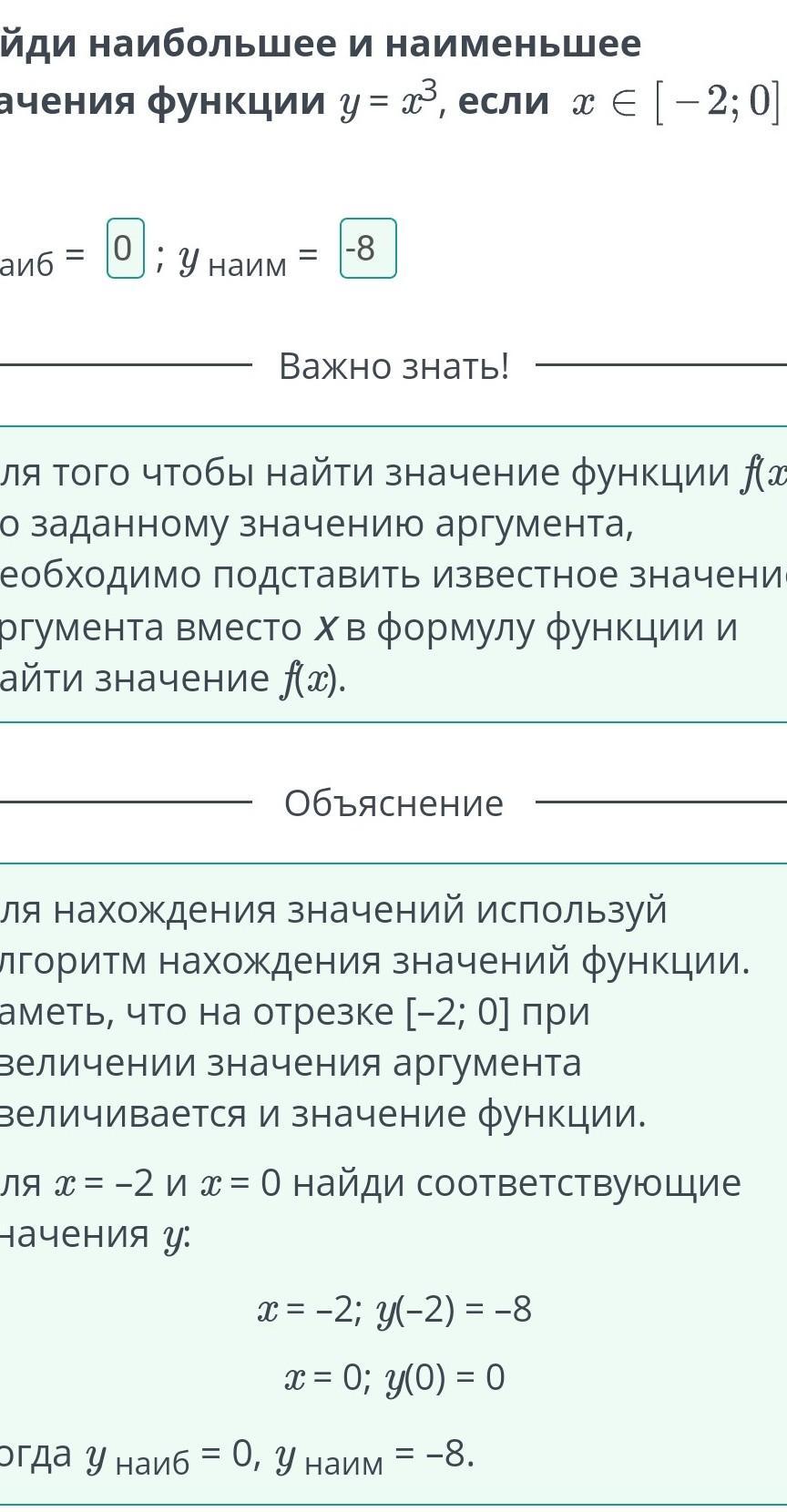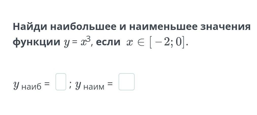 Найди наибольшее и наименьшее значения функции у = x3, если x ∈ [-2; 0]. У наиб = D: У наим =