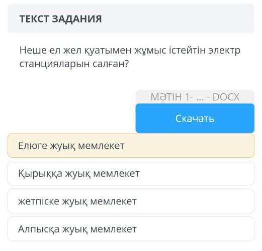 ТЕКСТ ЗАДАНИЯ Неше ел жел куатымен жұмыс істейтін электр станцияларын салған?