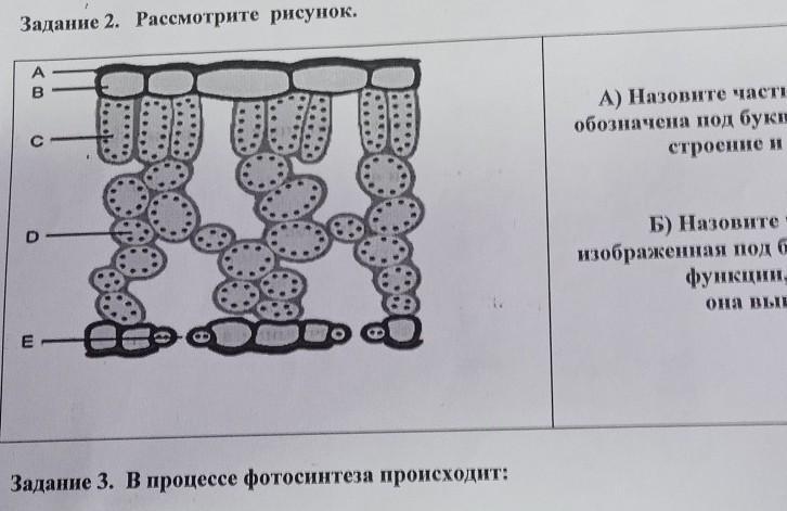 Задание 2. Рассмотрите рисунок. 5 B E А) Назовите часть листа, которая обозначена под буквой С и опишите её строение и функции. Б) Назовите часть листа, изображенная под буквой Е, опишите функции, которые она выполняет.
