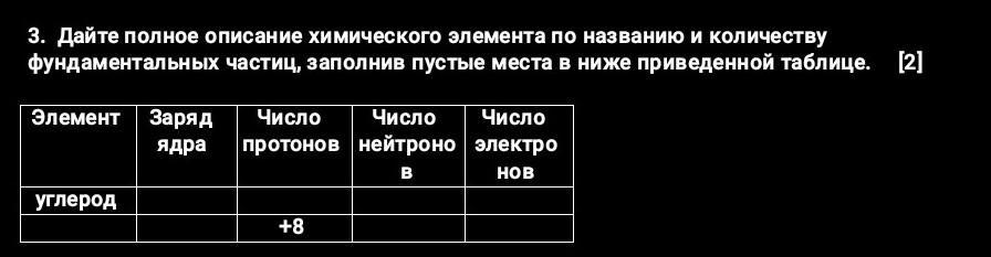 3. Дайте полное описание химического элемента по названию и количеству фундаментальных частиц, заполнив пустые места в ниже приведенной таблице. Элемент Заряд Число углерод Число +8 ядра протонов нейтроноэлектро Число B НОВ