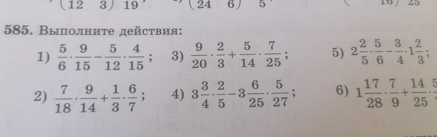 585. Выполните 1) 2) действия: 5 9 5 4 6 15 12 15 1 6 79 + 18 14 3 7 3) 2 57 + 9 20 3 14 25 32 4) 3-3 4 5 ; 6 5 25 27 5) 2 25 5 3 3 2 1 564 3 17 7 14 5 + 28 9 25 7 6) 117