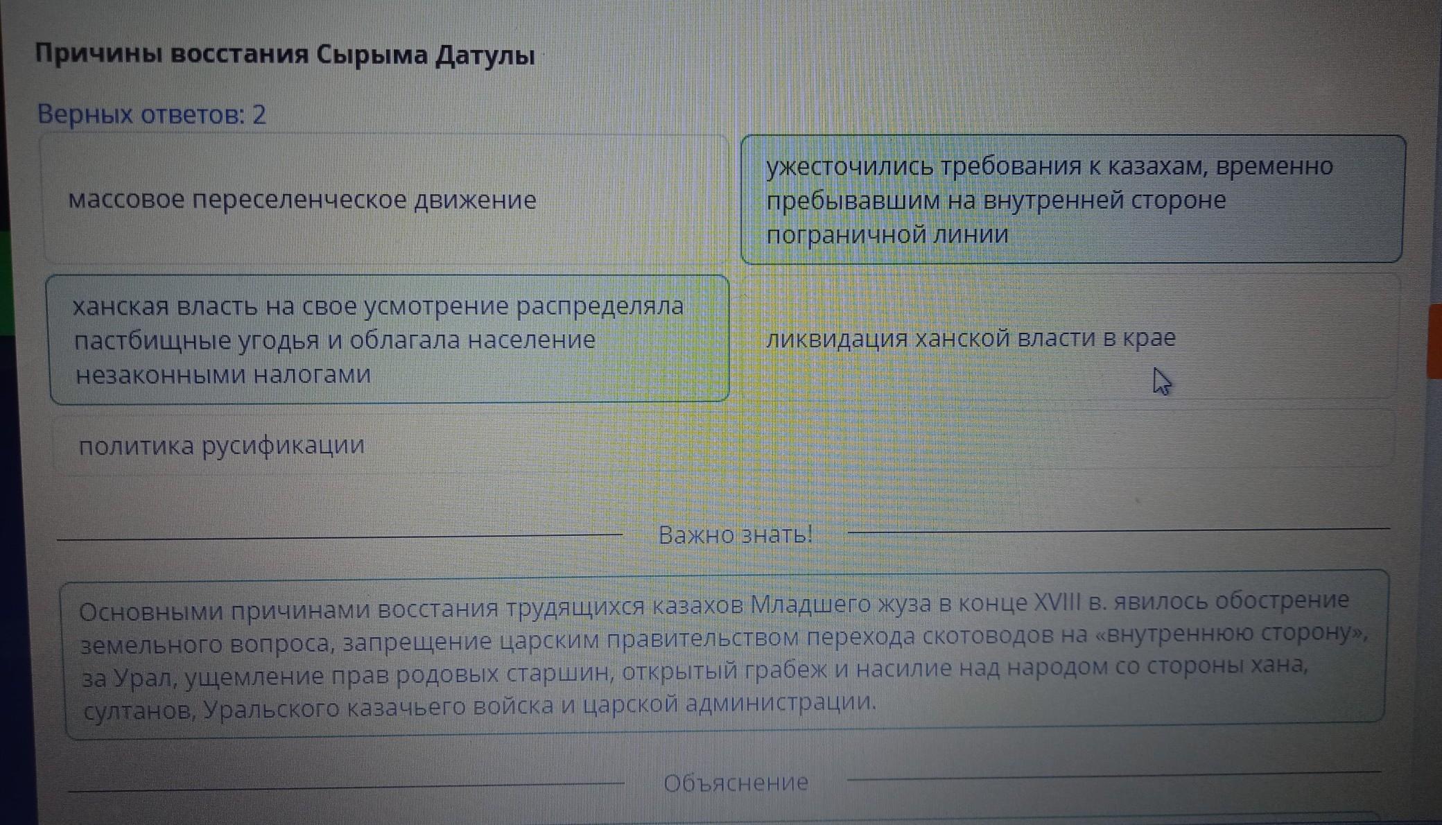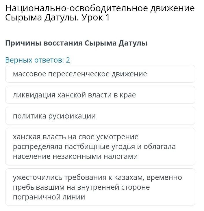 Национально-освободительное движение Сырыма Датулы. Урок 1 Причины восстания Сырыма Датулы Верных ответов: 2 массовое переселенческое движение ликвидация ханской власти в крае ханская власть на свое усмотрение распределяла пастбищные угодья и облагала население незаконными налогами ужесточились требования к казахам, временно пребывавшим на внутренней стороне пограничной линии политика русификации