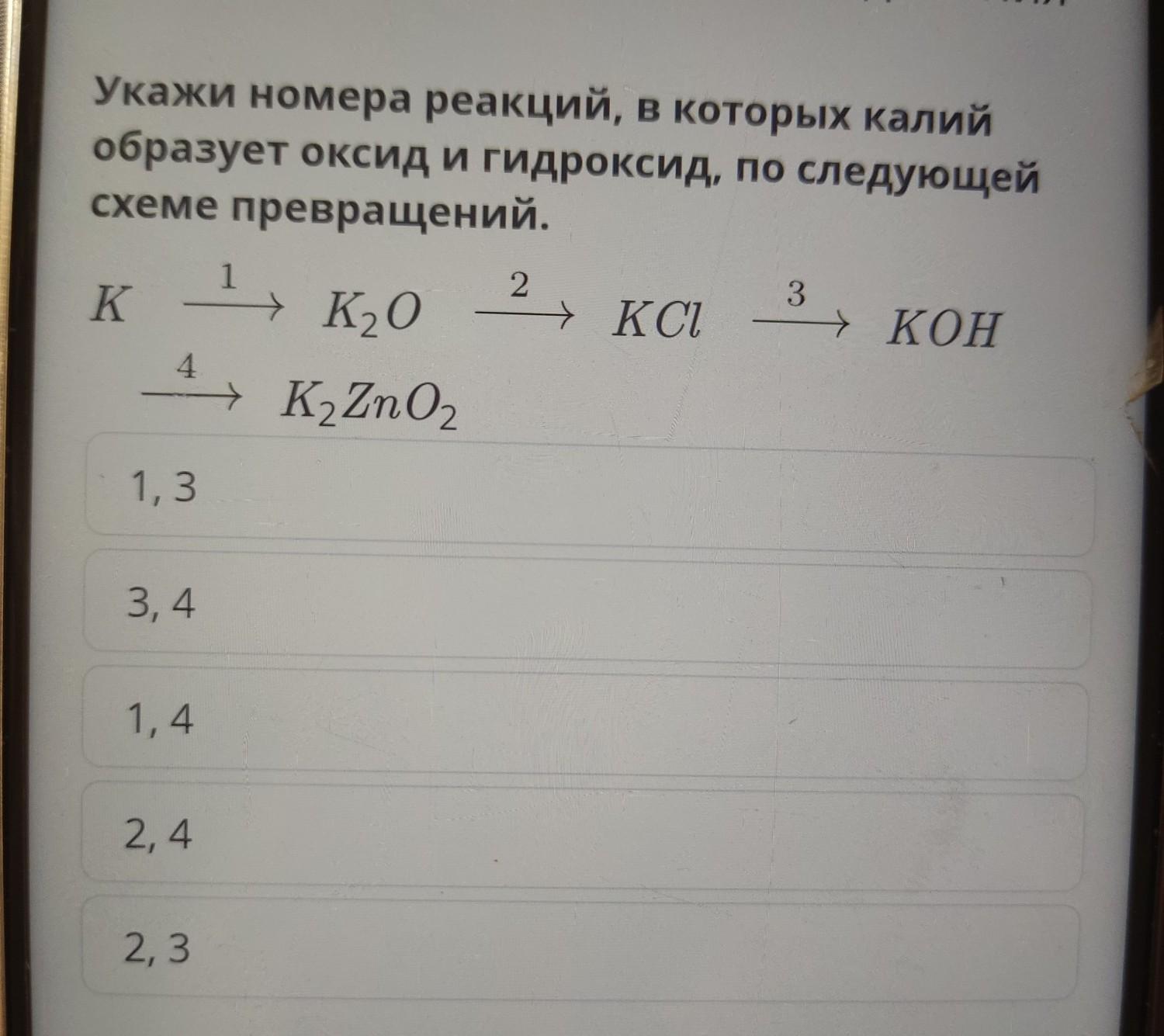 Укажи номера реакций, в которых калий образует оксид и гидроксид, по следующей схеме превращений. K K20 KzZnO2 4 → 1,3 3,4 1,4 2,4 1 2,3 2 + KCl 3 → КОН